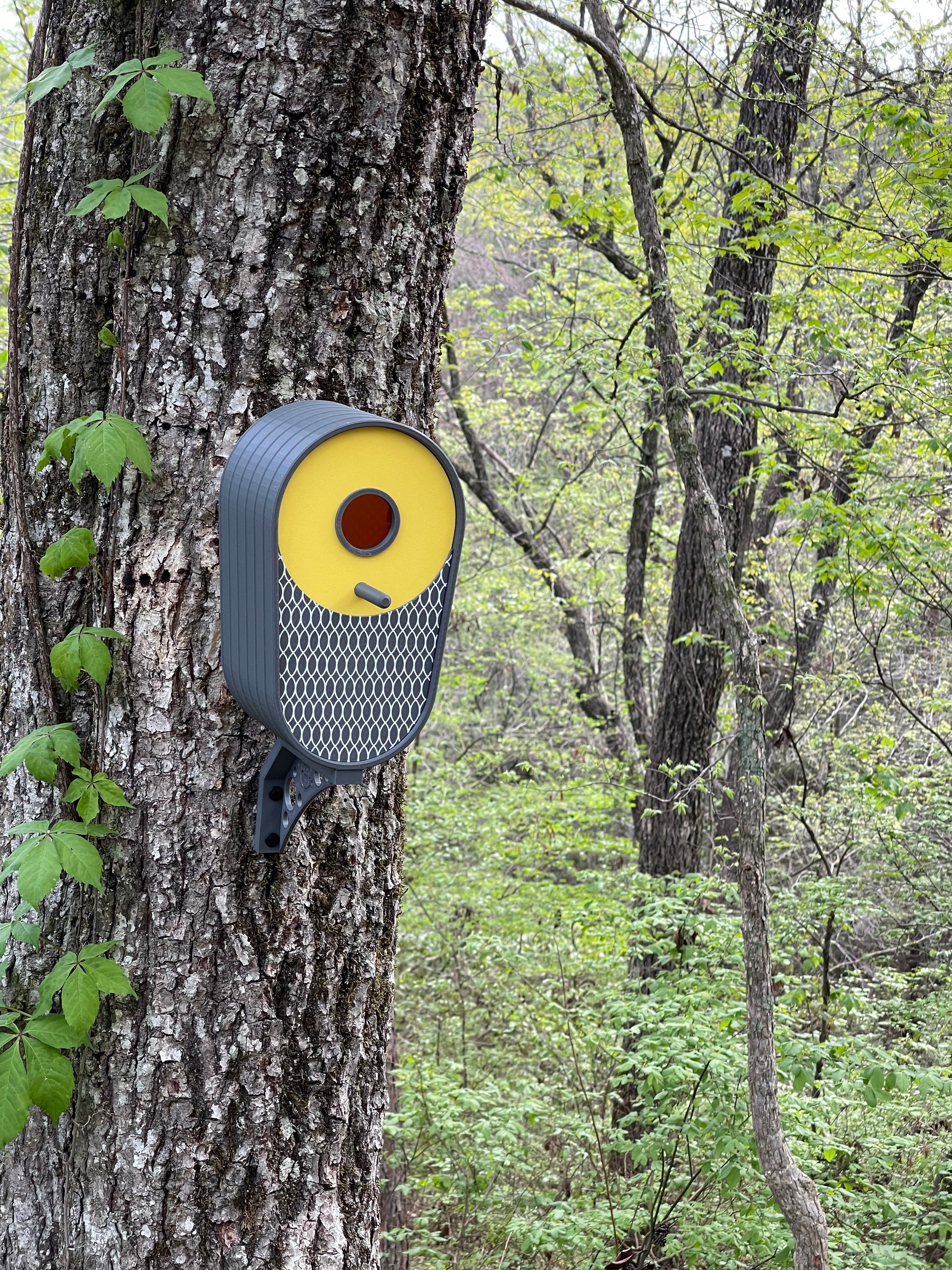Imagine this sleek vertical sculpture mounted in your garden or on your balcony, the dark grey body contrasting beautifully with the bright yellow accent while native birds make it their home. The vertical design makes it perfect for modern spaces where horizontal room is limited, while the contemporary colour scheme complements modern architecture and minimalist garden design. It's the perfect blend of form, function, and modern style.